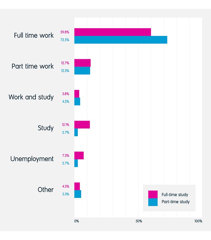 Outcomes of 2014/15 Masters graduates six months after graduation by mode of study.